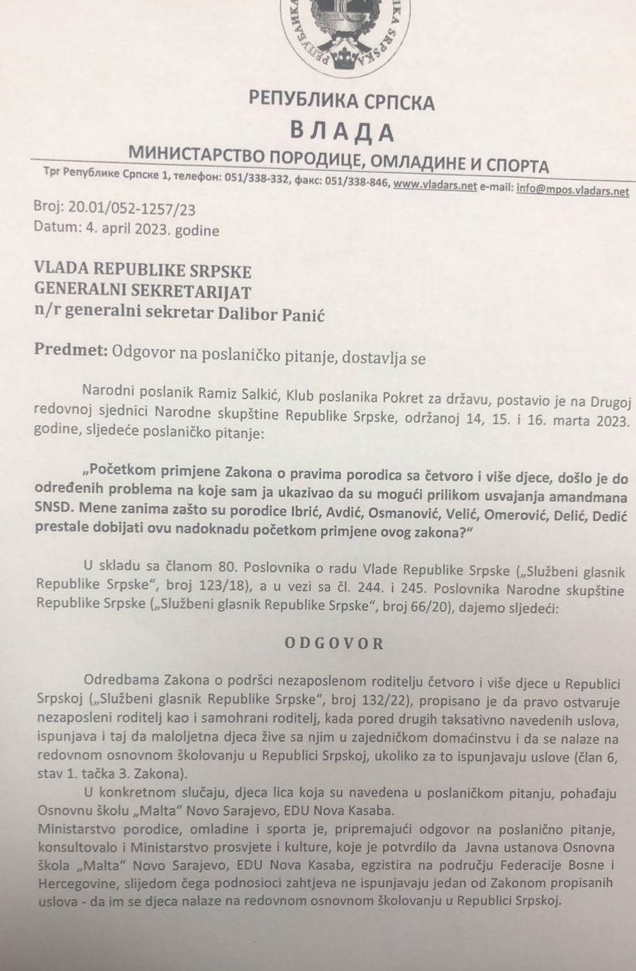 Kako se i pored ovog obećanja pojavio problem kod određenog broja porodica narodni poslanik Salkić uputio je poslanička pitanja prema Ministarstvu porodice, omladine i sporta od kojeg je dobio negativan odgovor koji vam prenosimo u cjelosti.